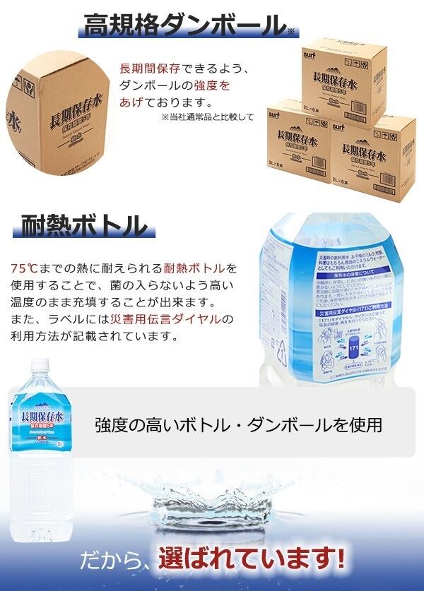 長期保存用ミネラルウォーター、軟水、避難グッズ、防災グッズ、避難用品、防災用品、保存食、2リットル、500ミリリットル、ほぞんすい、びちくすい、ちょうきほぞんすい