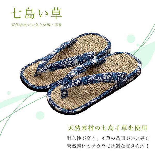 おしゃれな柄の和風モダンな七島の草履です。表地にベトナムの太陽の下で元気に育った七島イ草を使用しています。七島イ草はベトナムでとれる草の一種で、日本のイ草によく似た効能を持ち合わせています。肌触りは自然素材ならではの「ざっくり感とサラサラ感」で快適さを感じることができます。ざっくりとした生地なので通気性も良く、ムレやべとつきもありません。一つ一つ丁寧に編み込んでいますので、しっかりしていて丈夫です。裏面には丈夫なEVA付きです。
